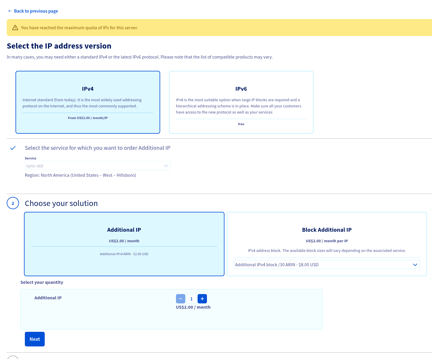 点击 Order IPs 购买一个IP, 注意这个IP购买时需要选择绑定到某个服务器(注意IP是有区域限制的, IP只能在同区域的服务器之间绑定), 后面可以随意更改绑定的服务器, 不需要担心