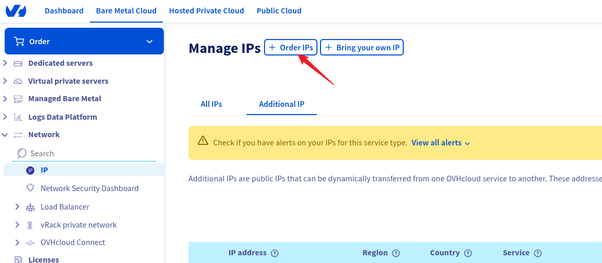 首先登录到OVH控制台的 Bare Metal Cloud -> Network -> IP