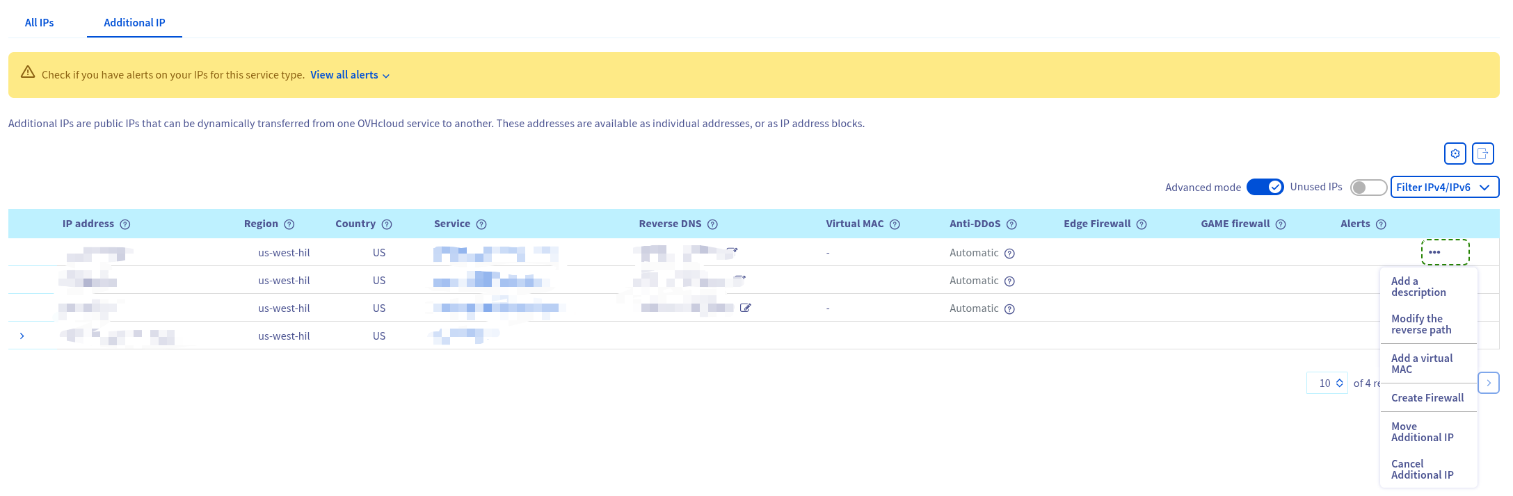 当IP准备好后OVH会发送给你一个邮件, 邮件中包含了分配给你的IP地址, 同时在控制台刷新也会看到. 在这里你可以更换绑定的服务器, 取消这个IP或者配置RDNS等